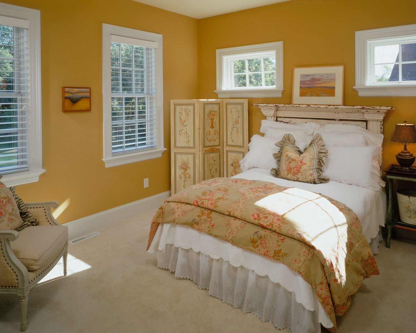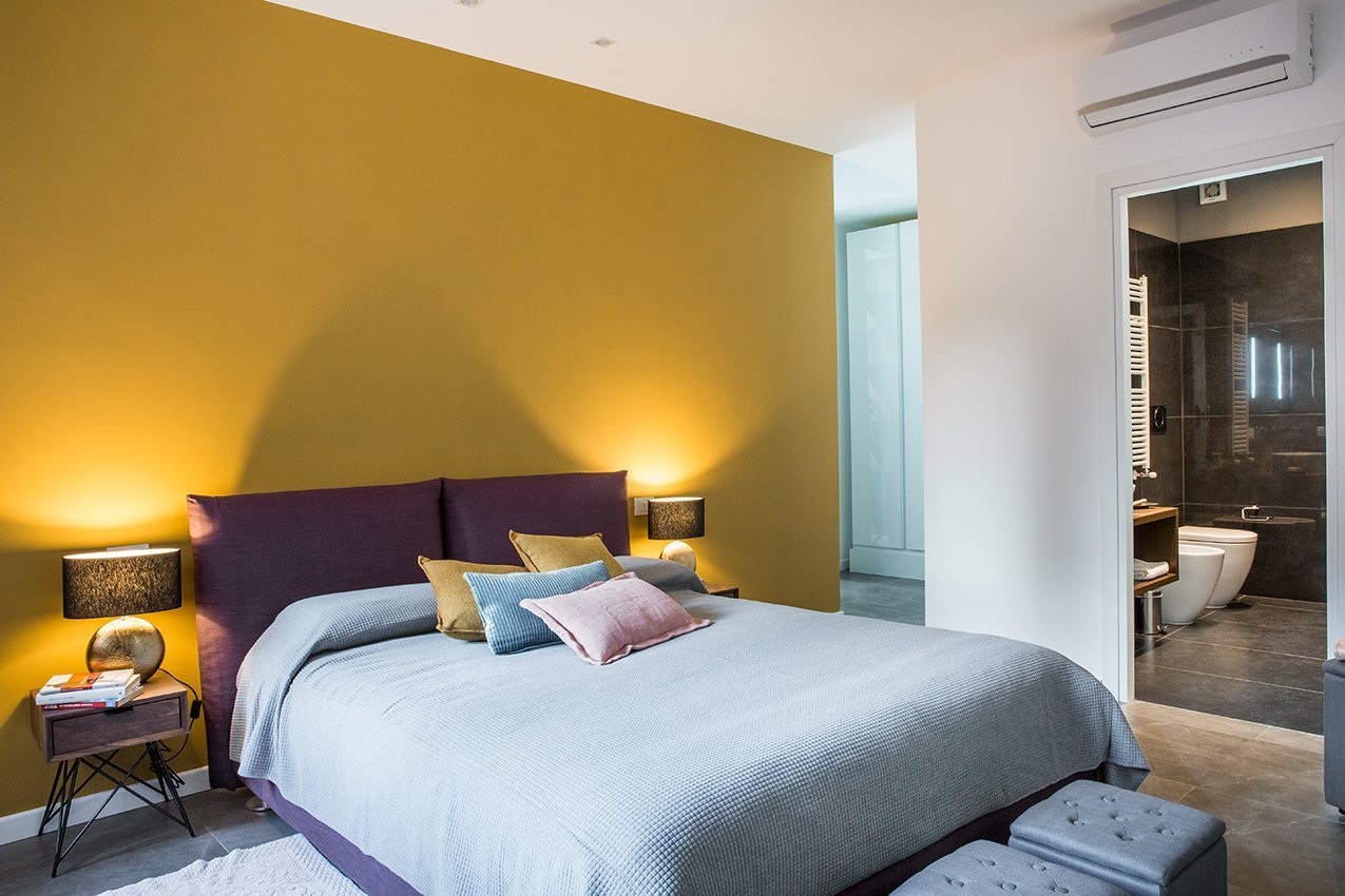 Интерьер спальни цвет охры стены