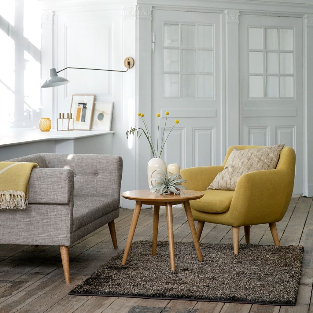 Сканди гостиная с желтым диваном