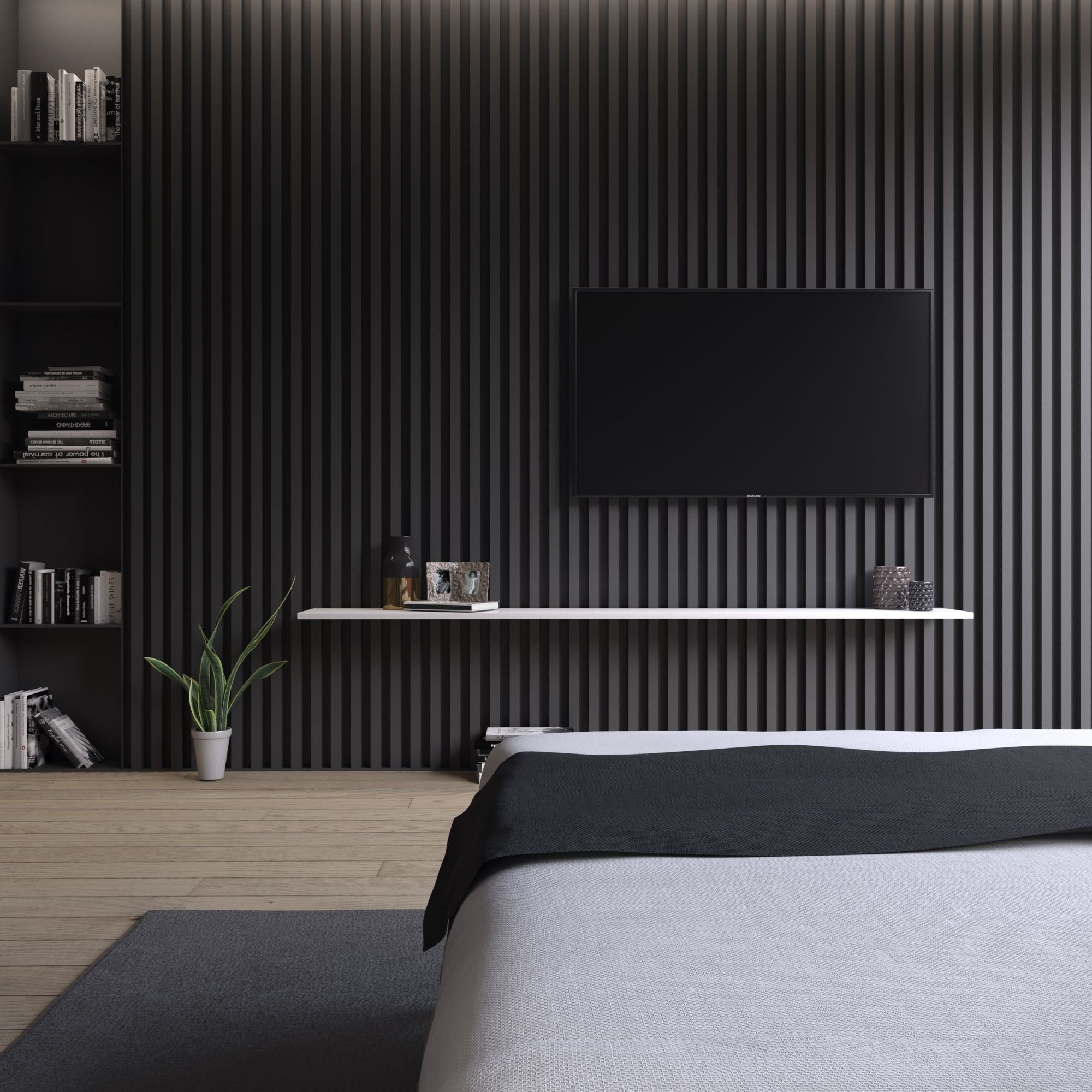 Черная стена с деревянными рейками
