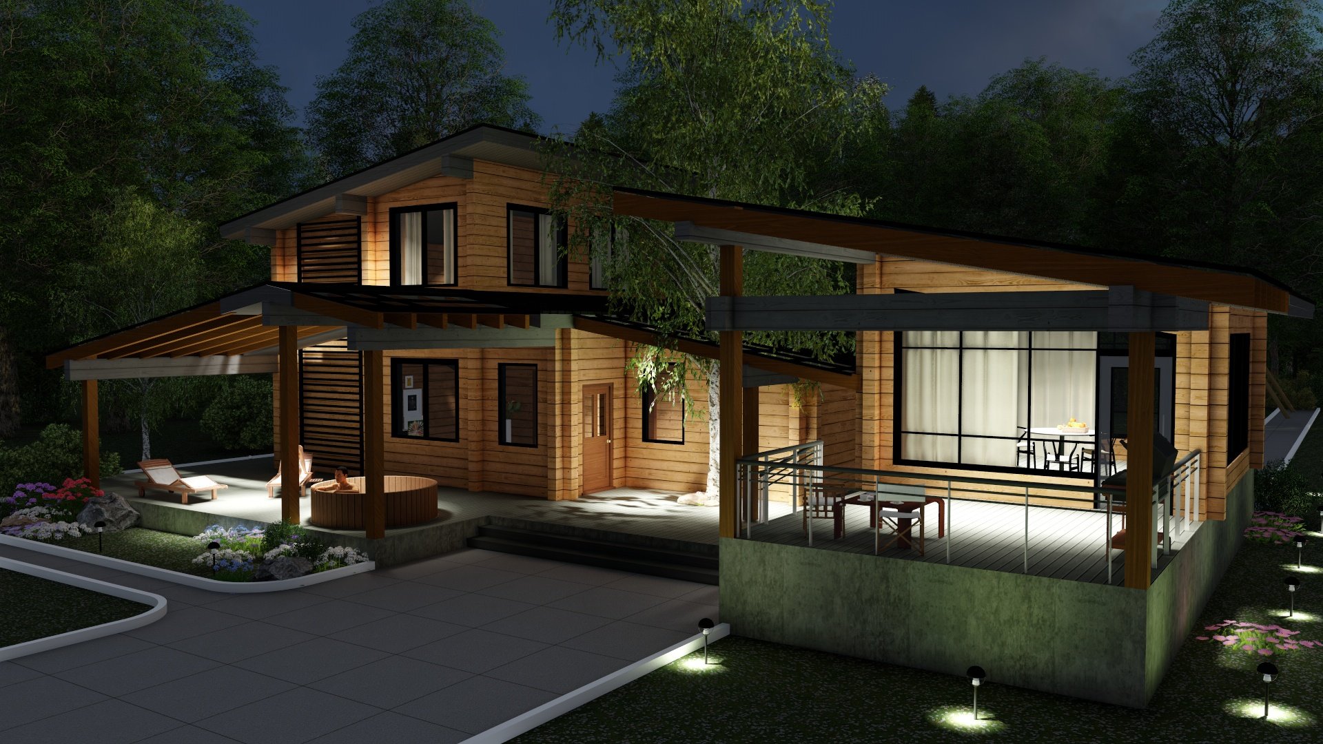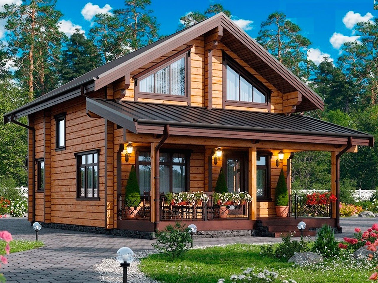Деревянный дом с балконом и террасой