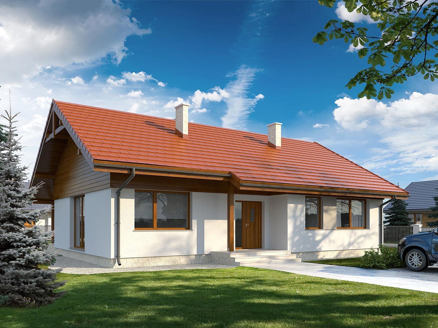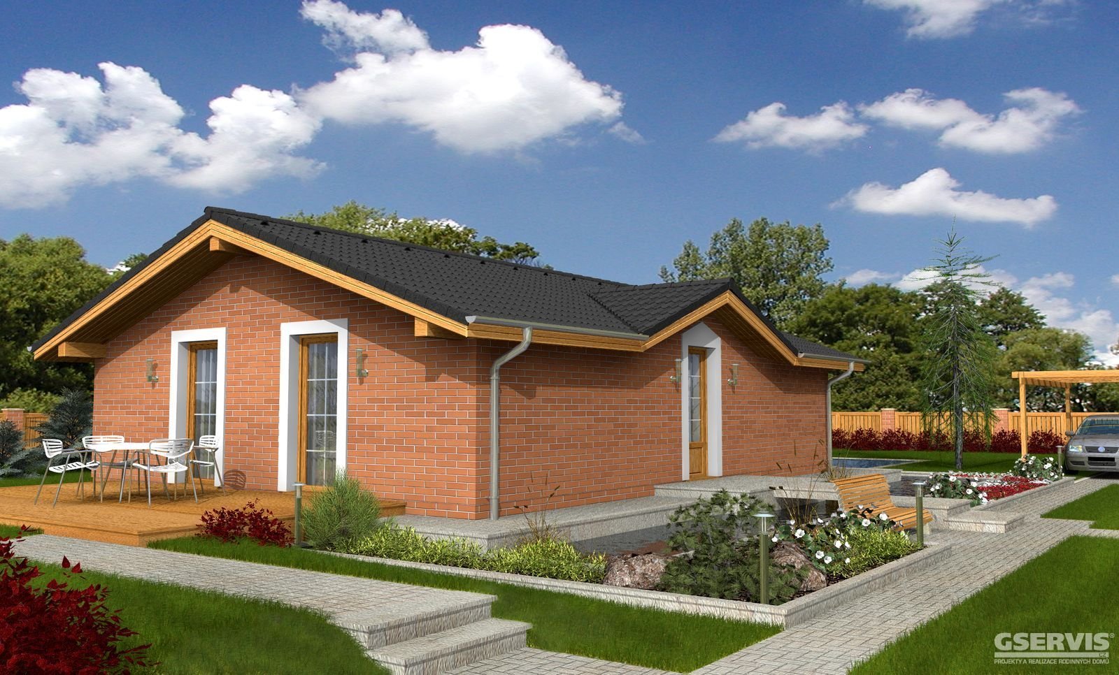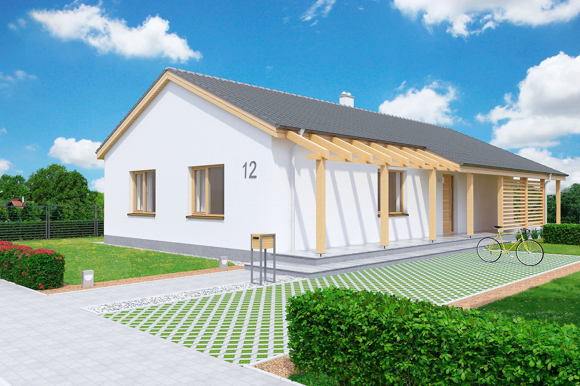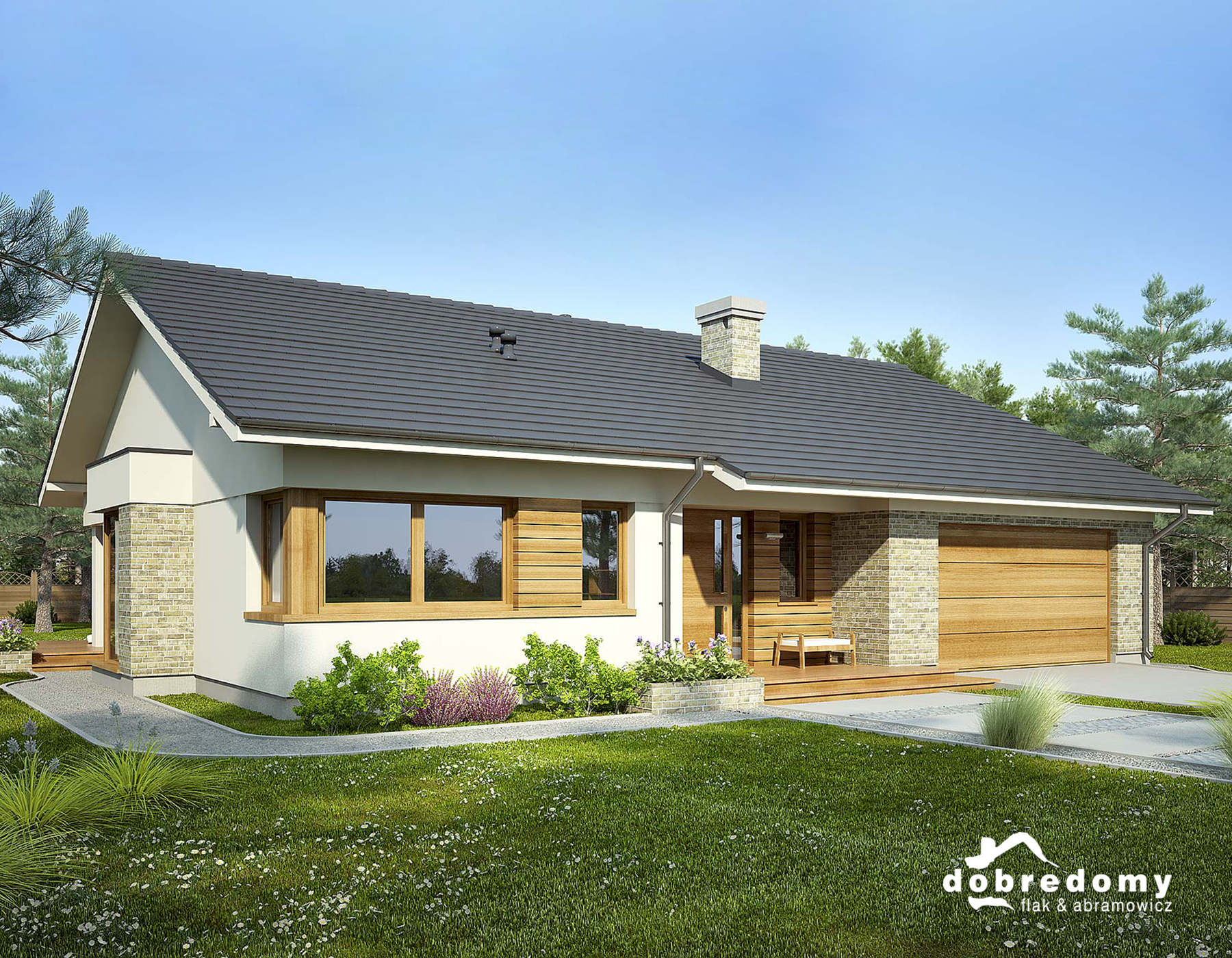 Одноэтажный дом с двухскатной крышей и гаражом