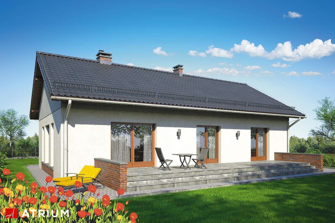 Одноэтажный дом с террасой 140 м2 с двухскатной крышей