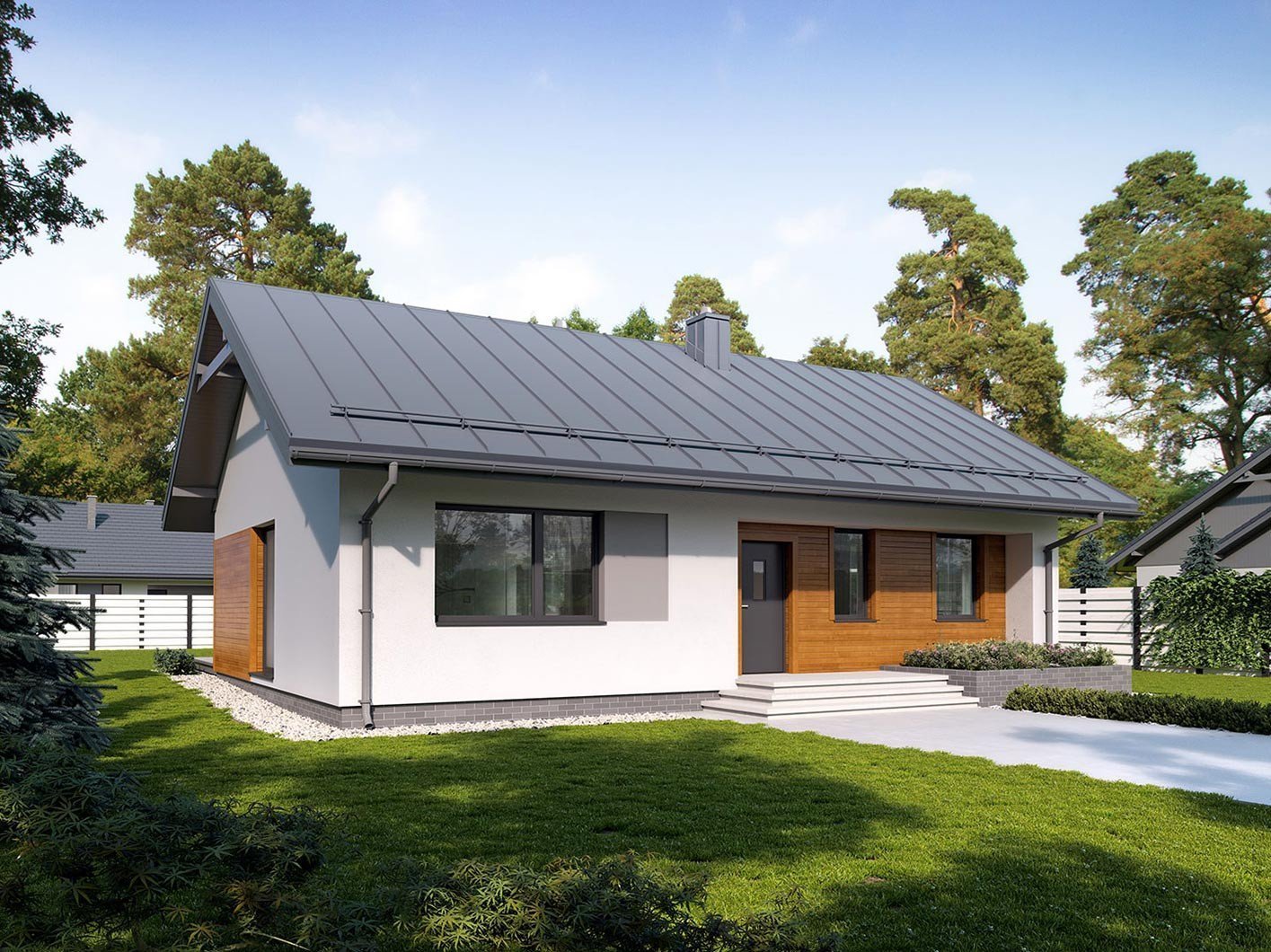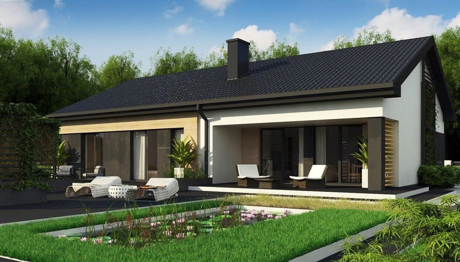 Современный одноэтажный дом с двускатной крышей