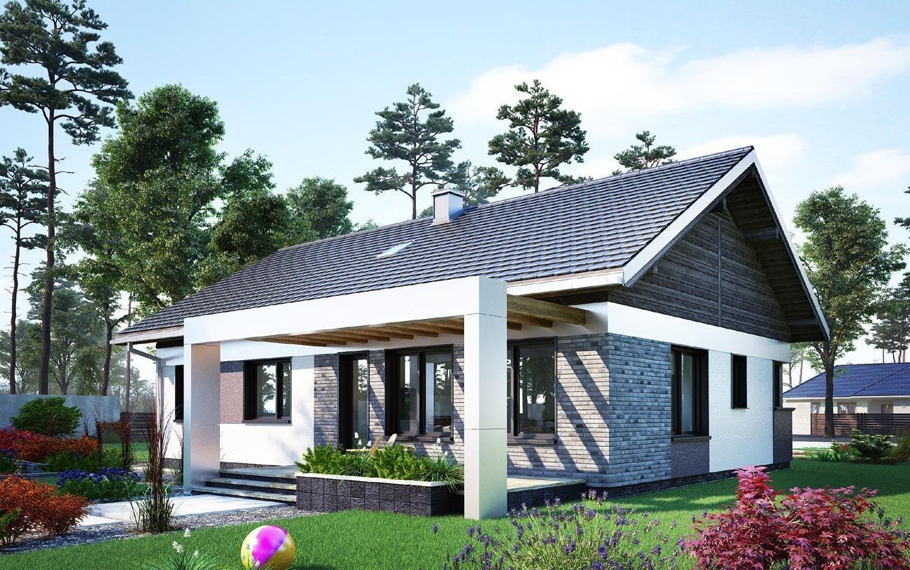 Одноэтажный дом с двускатной крышей и верандой