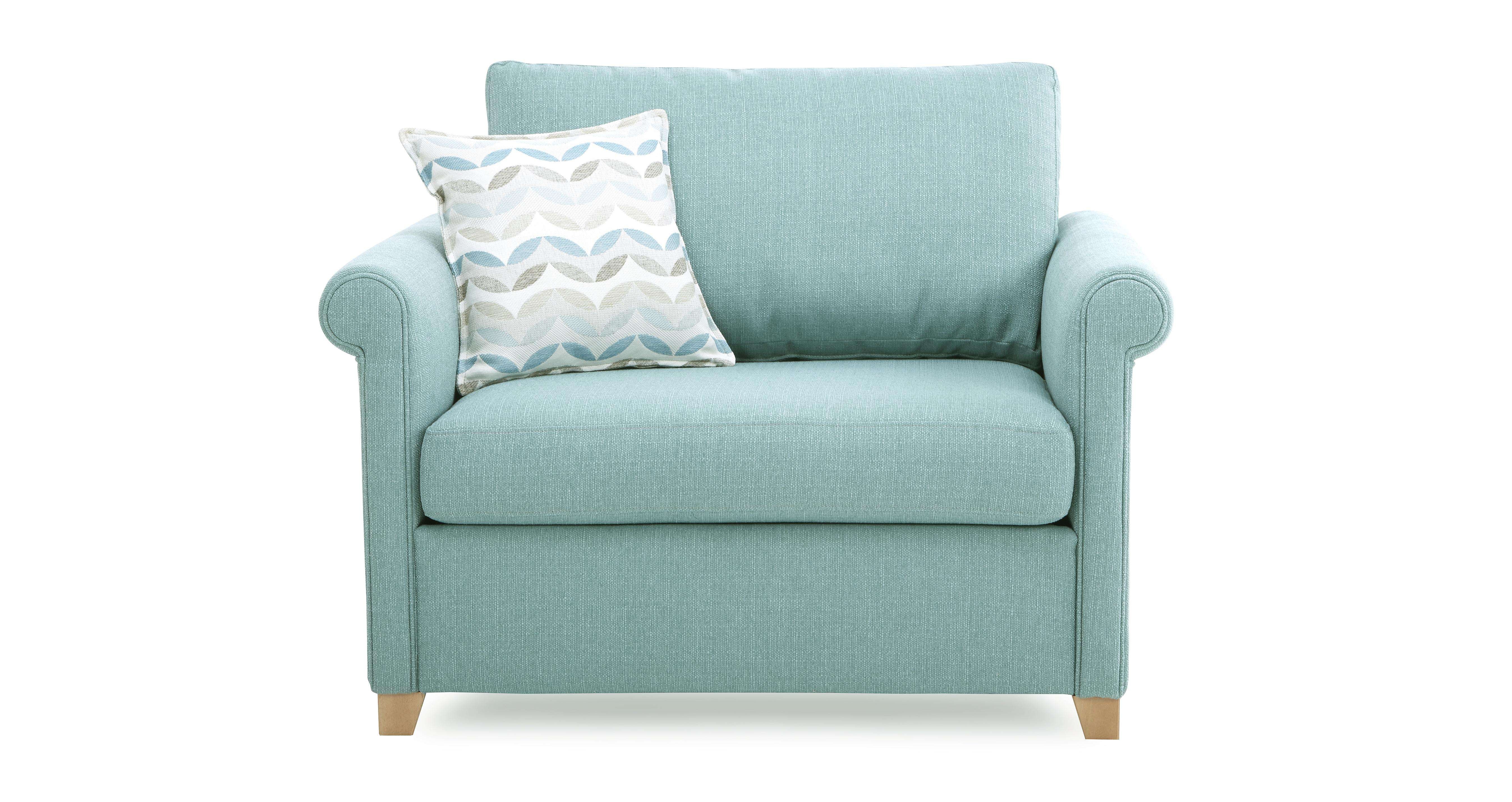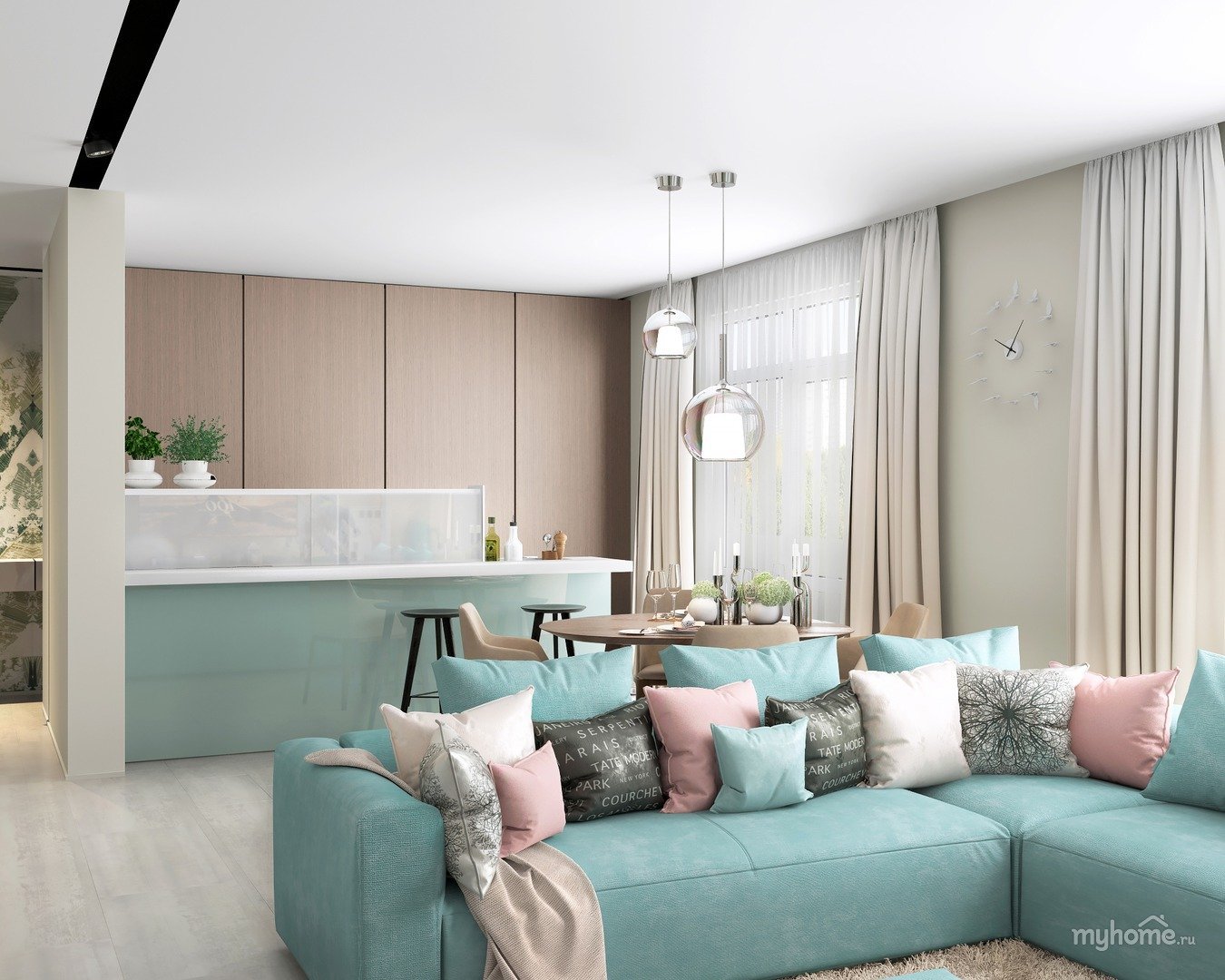 Гостиная в бирюзовых тонах в современном стиле с кухней