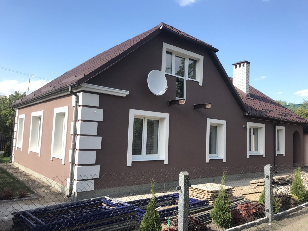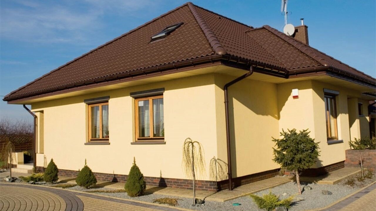 Оштукатуренный дом с белыми окнами