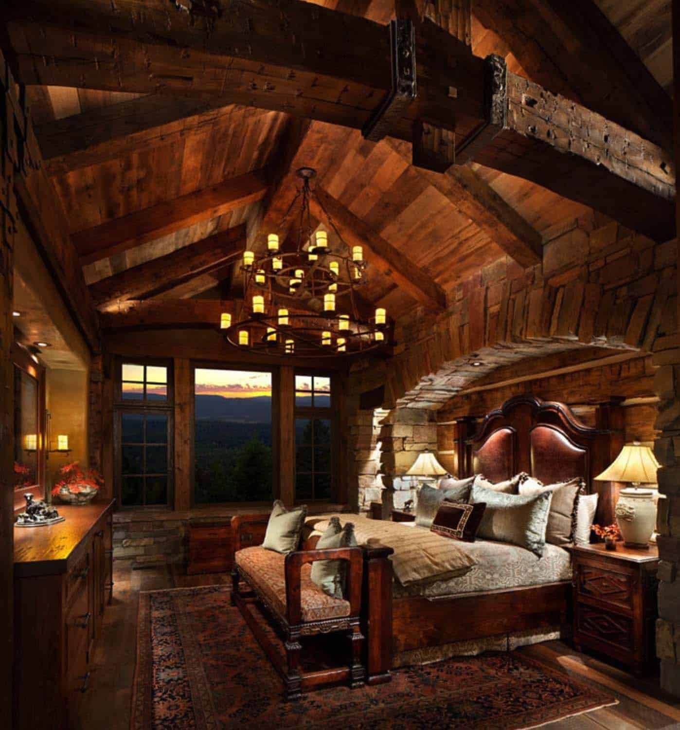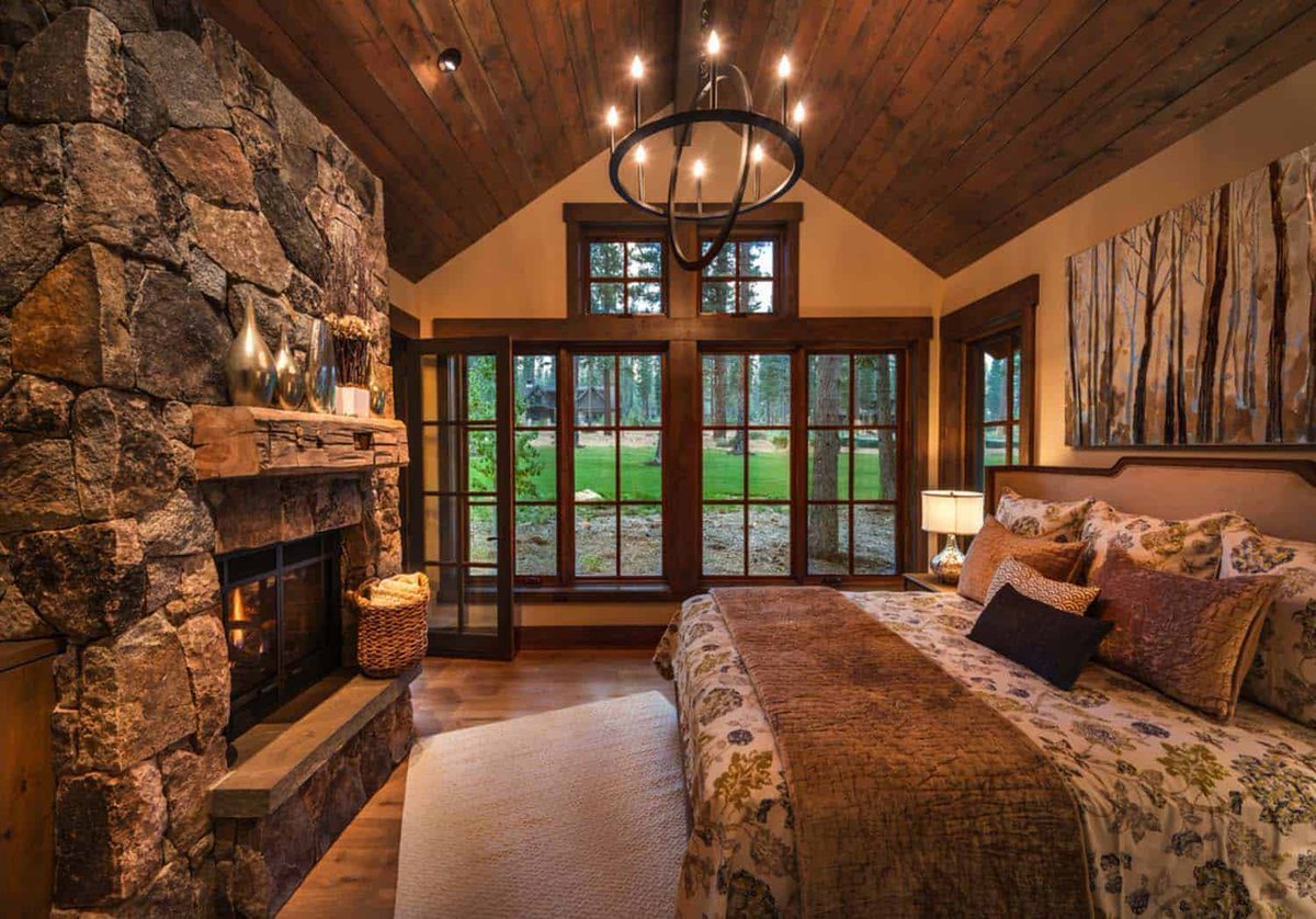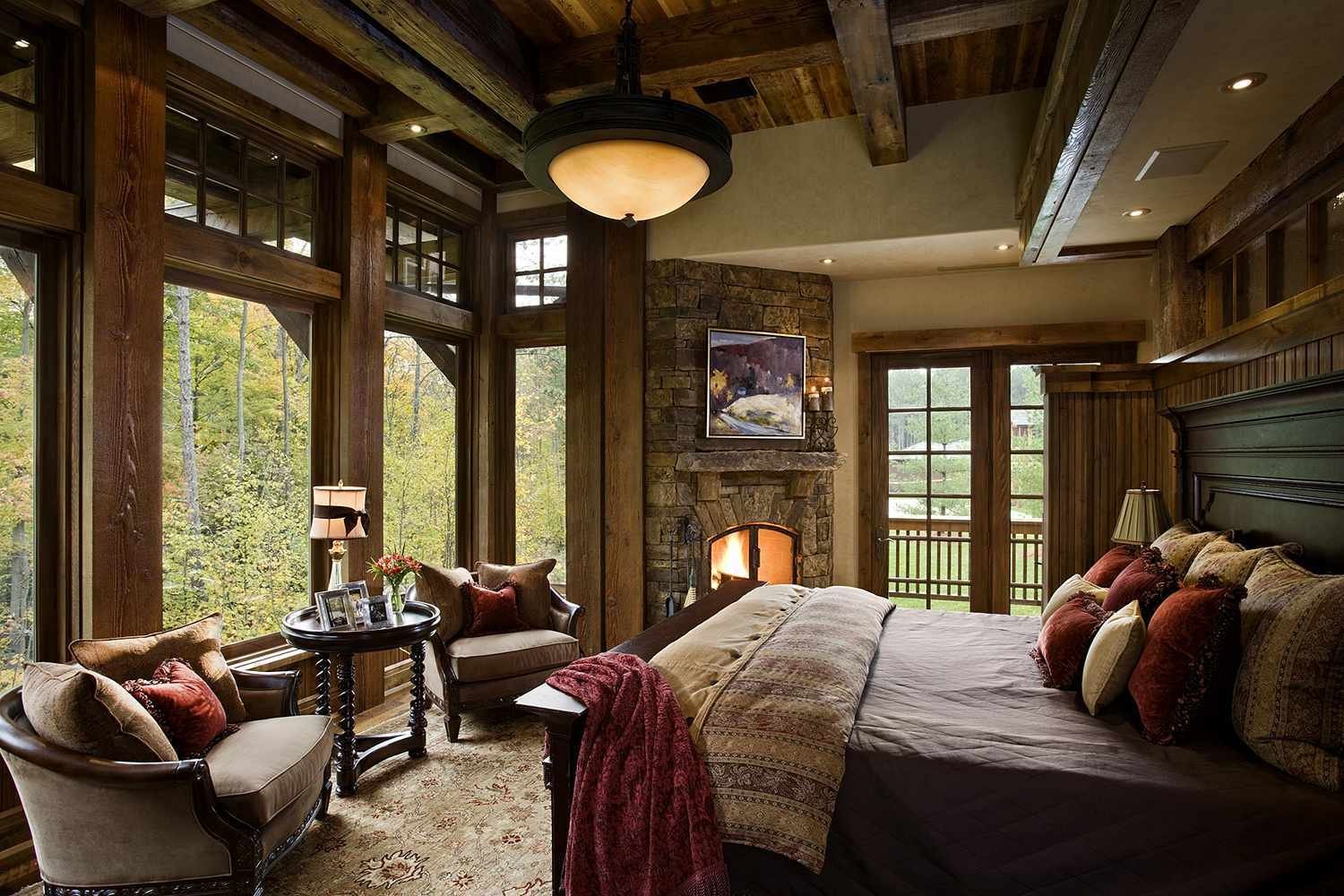 Деревянная спальня с камином