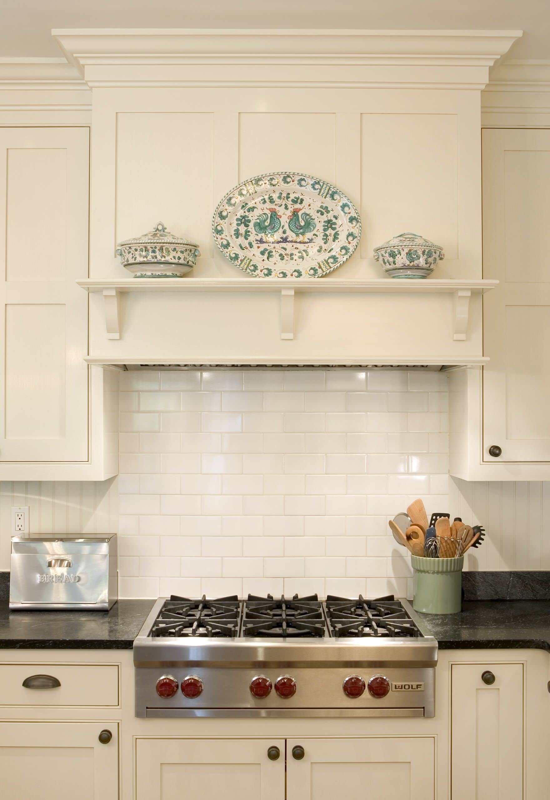 Полка над плитой в интерьере кухни