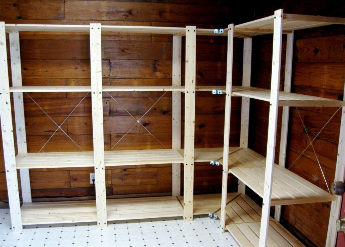 Деревянные стеллажи в сарае