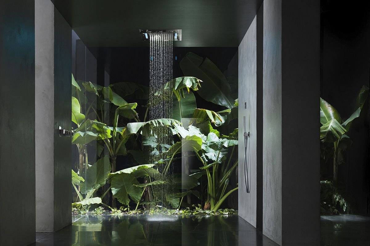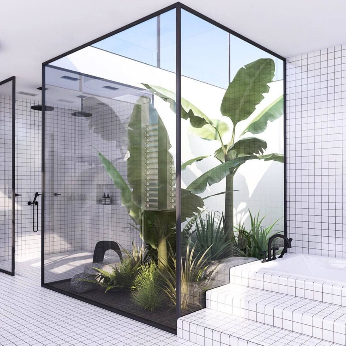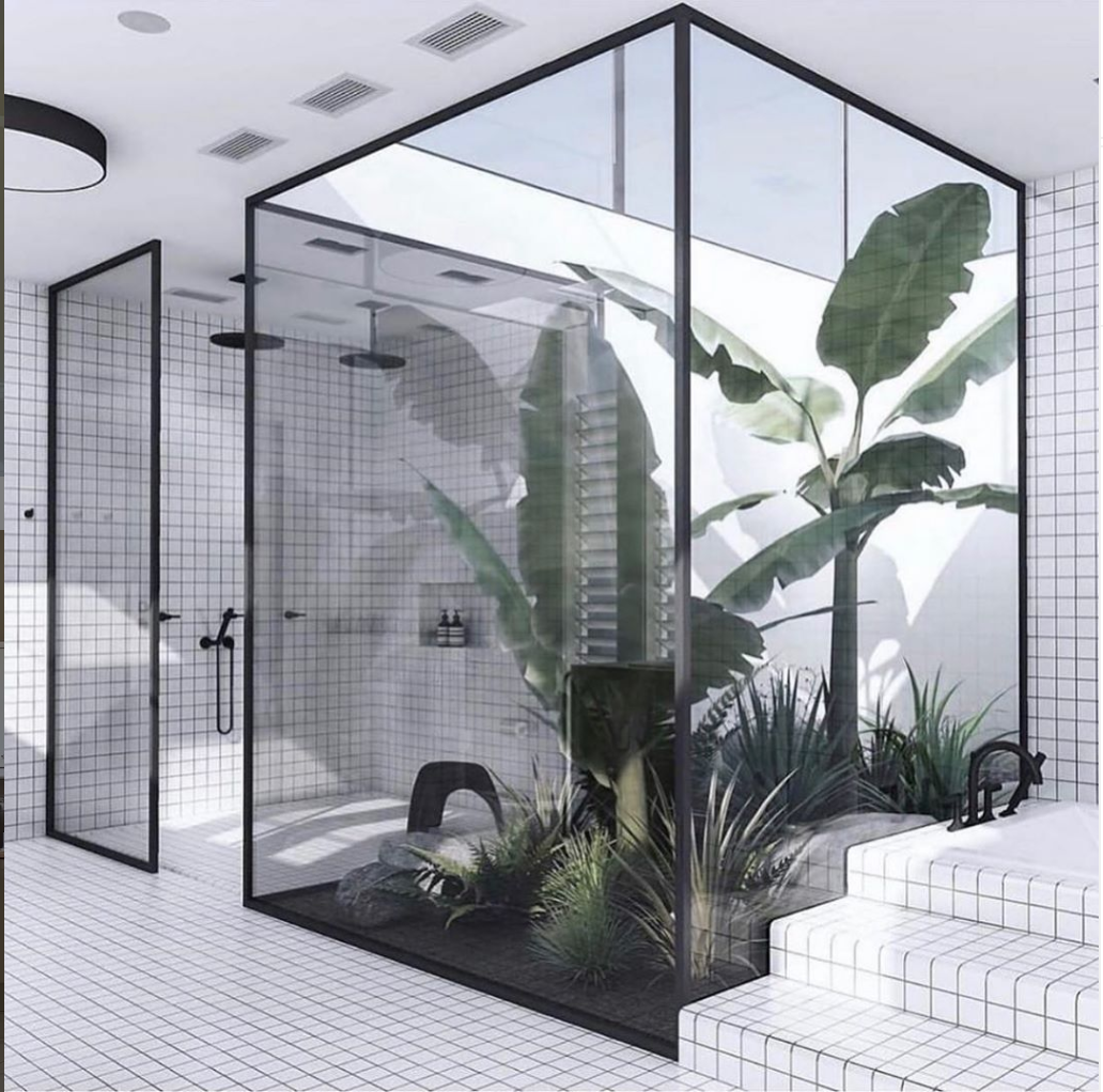 Plants behind Glass Bathroom