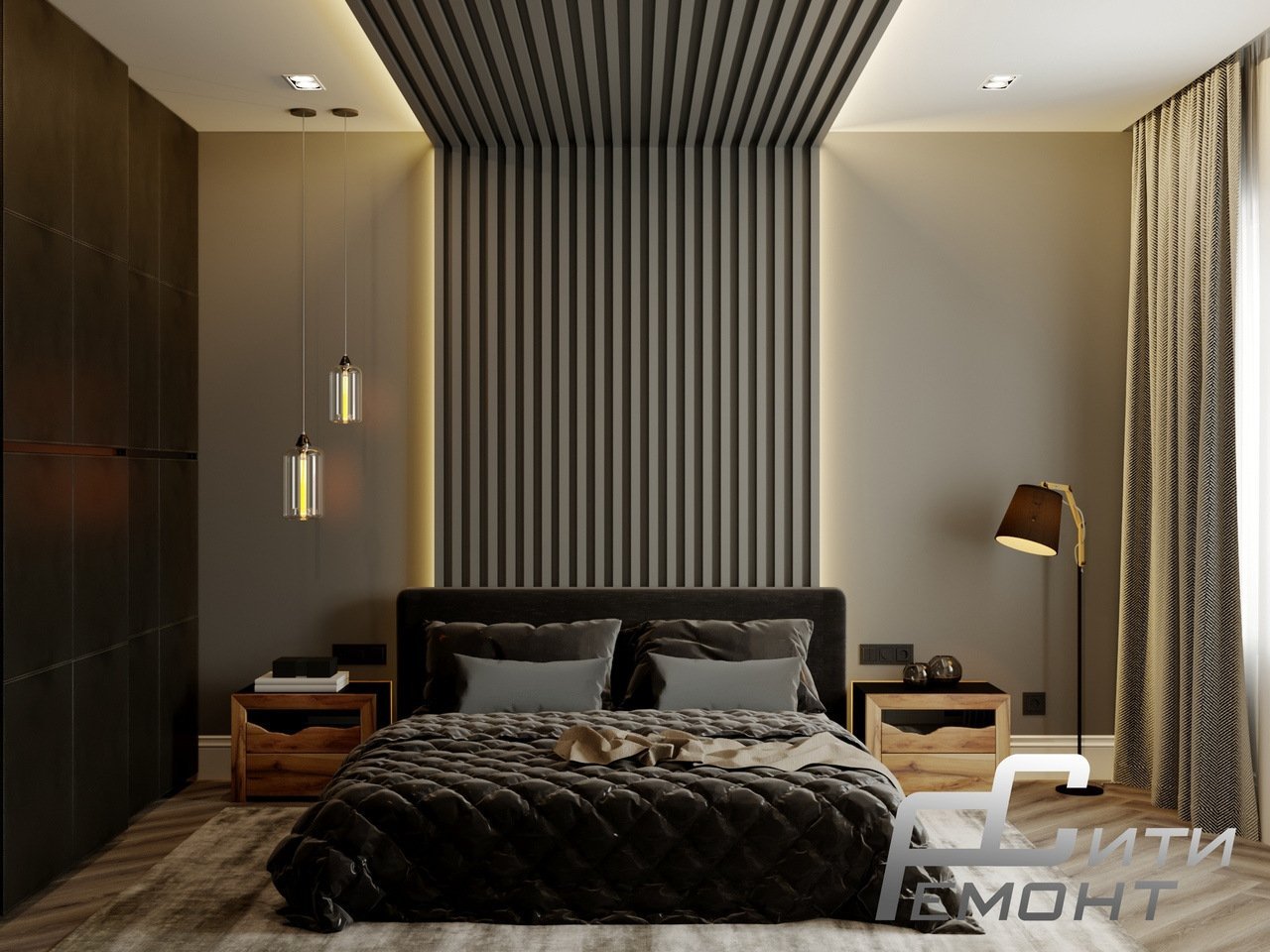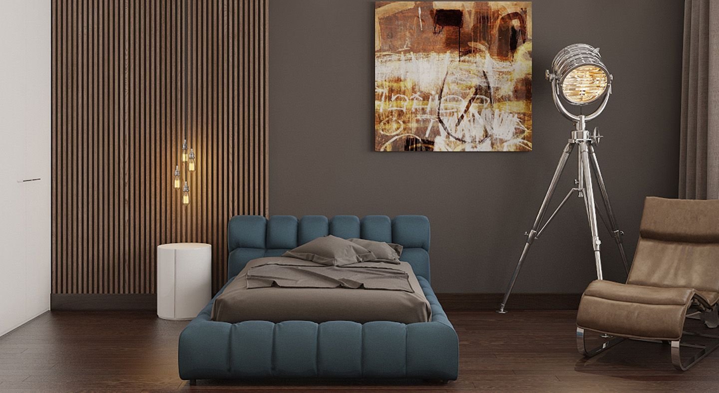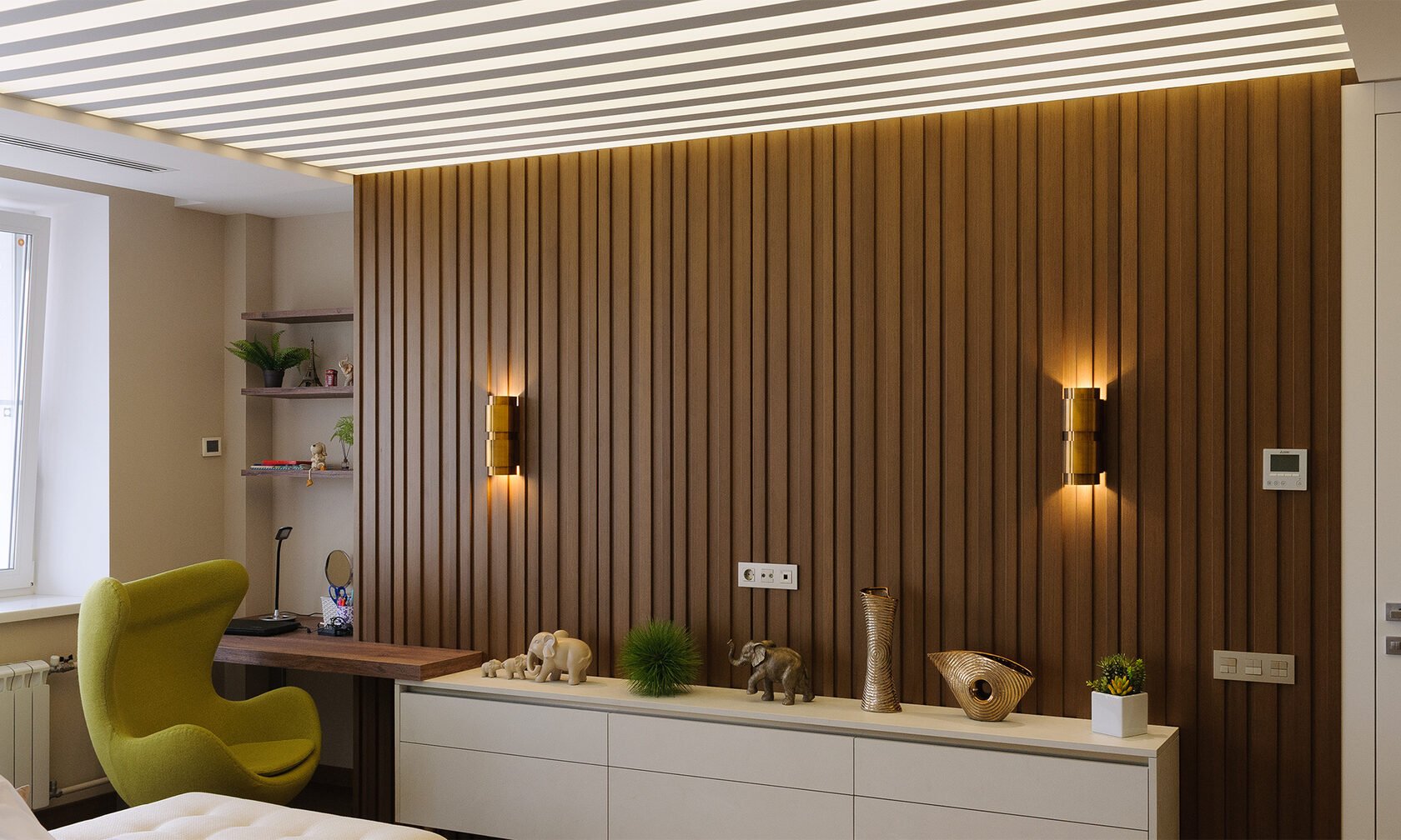 Спальня с рейками на стене