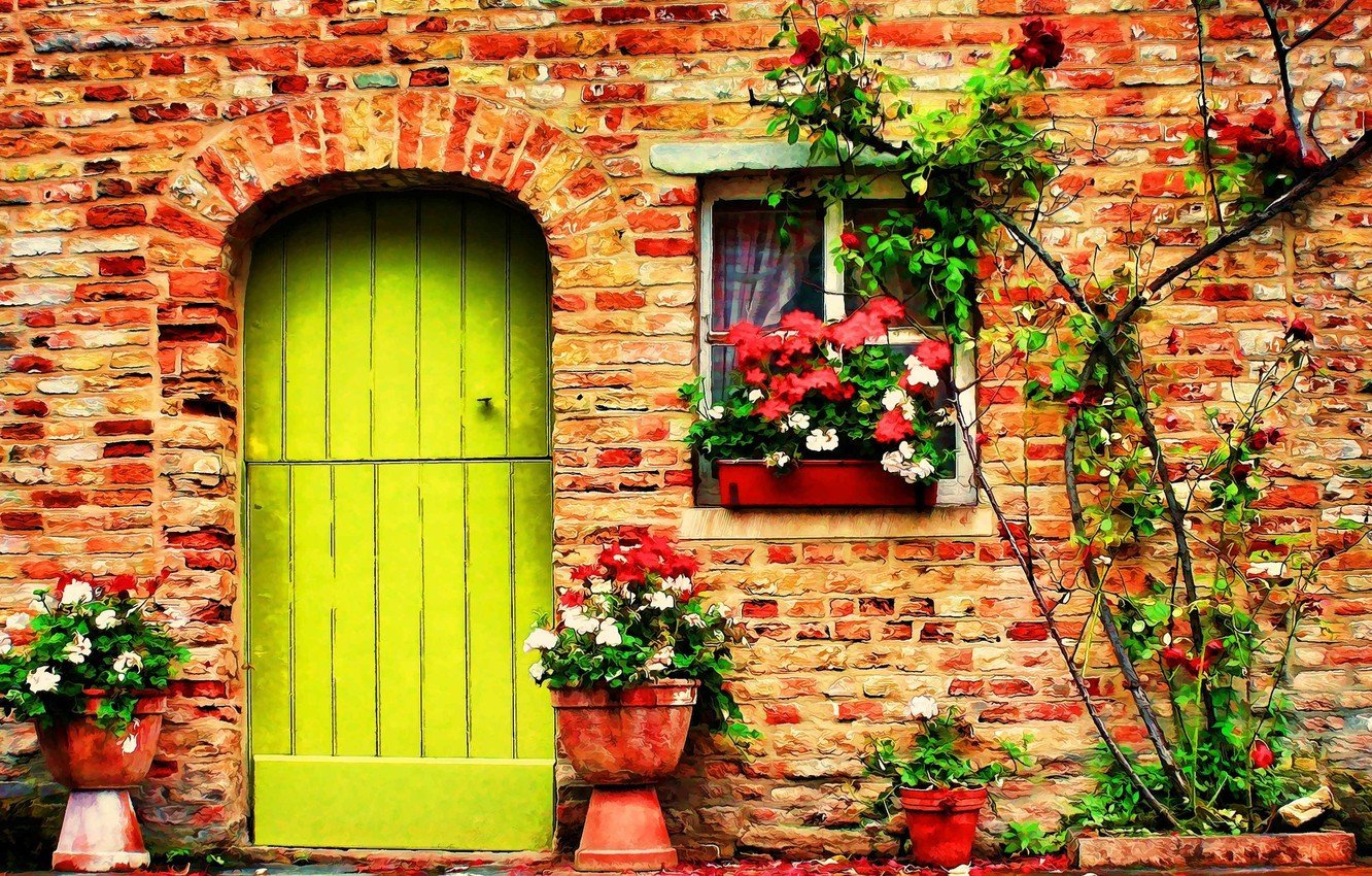 Цветы на фоне кирпичной стены