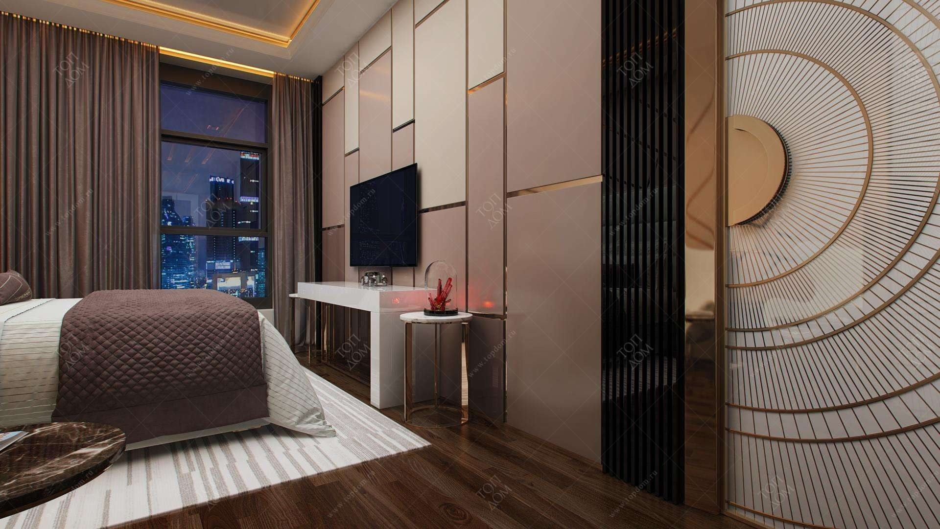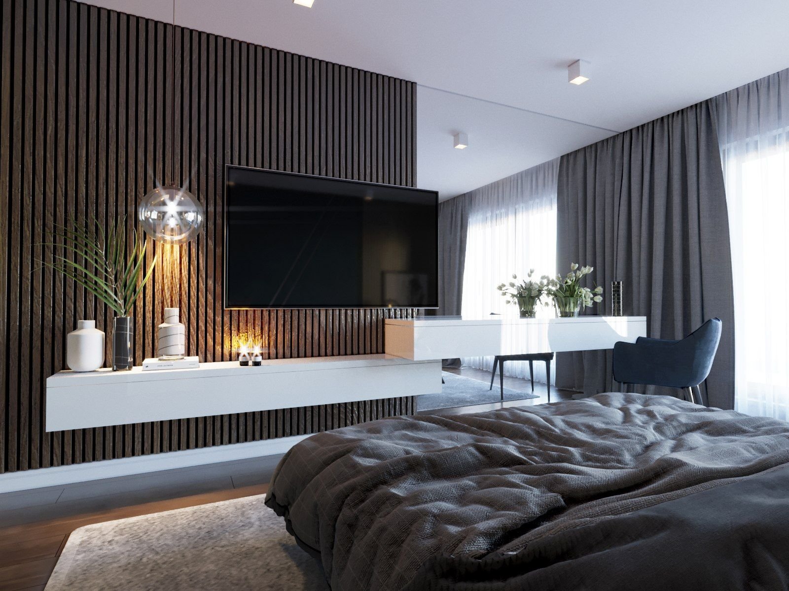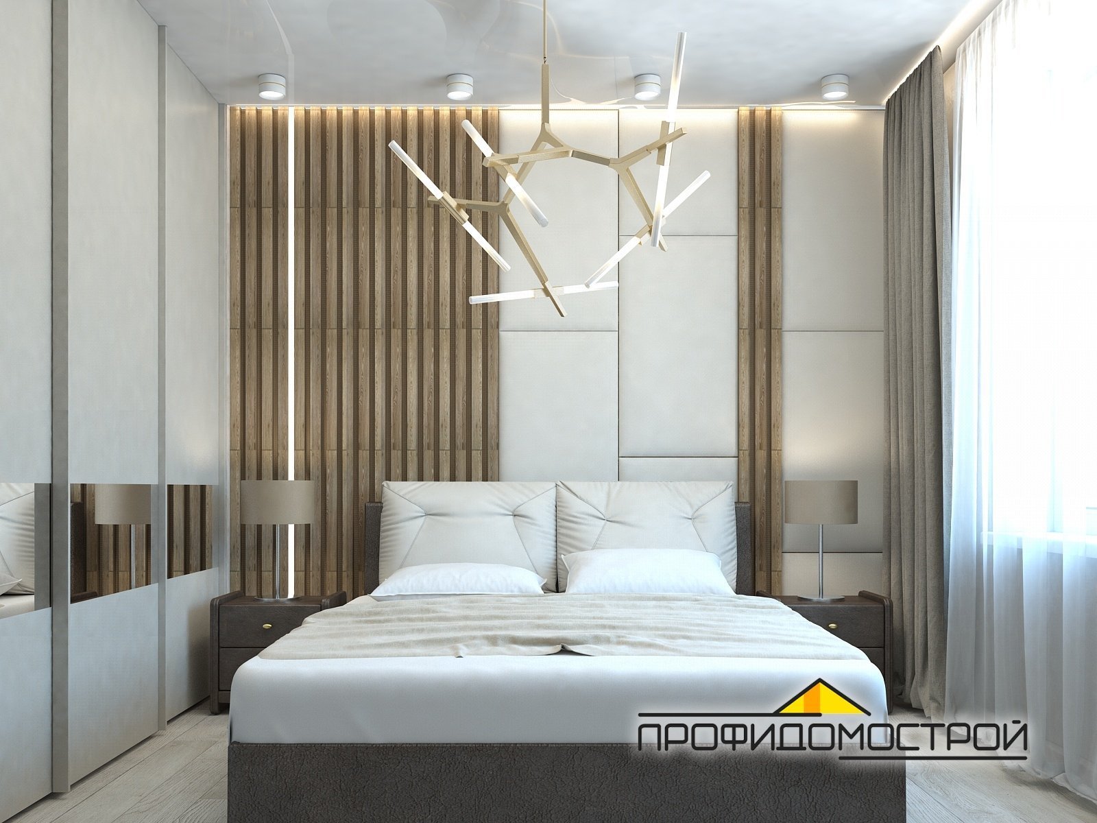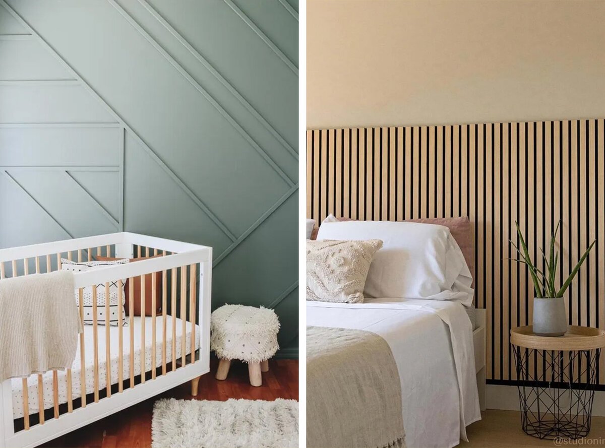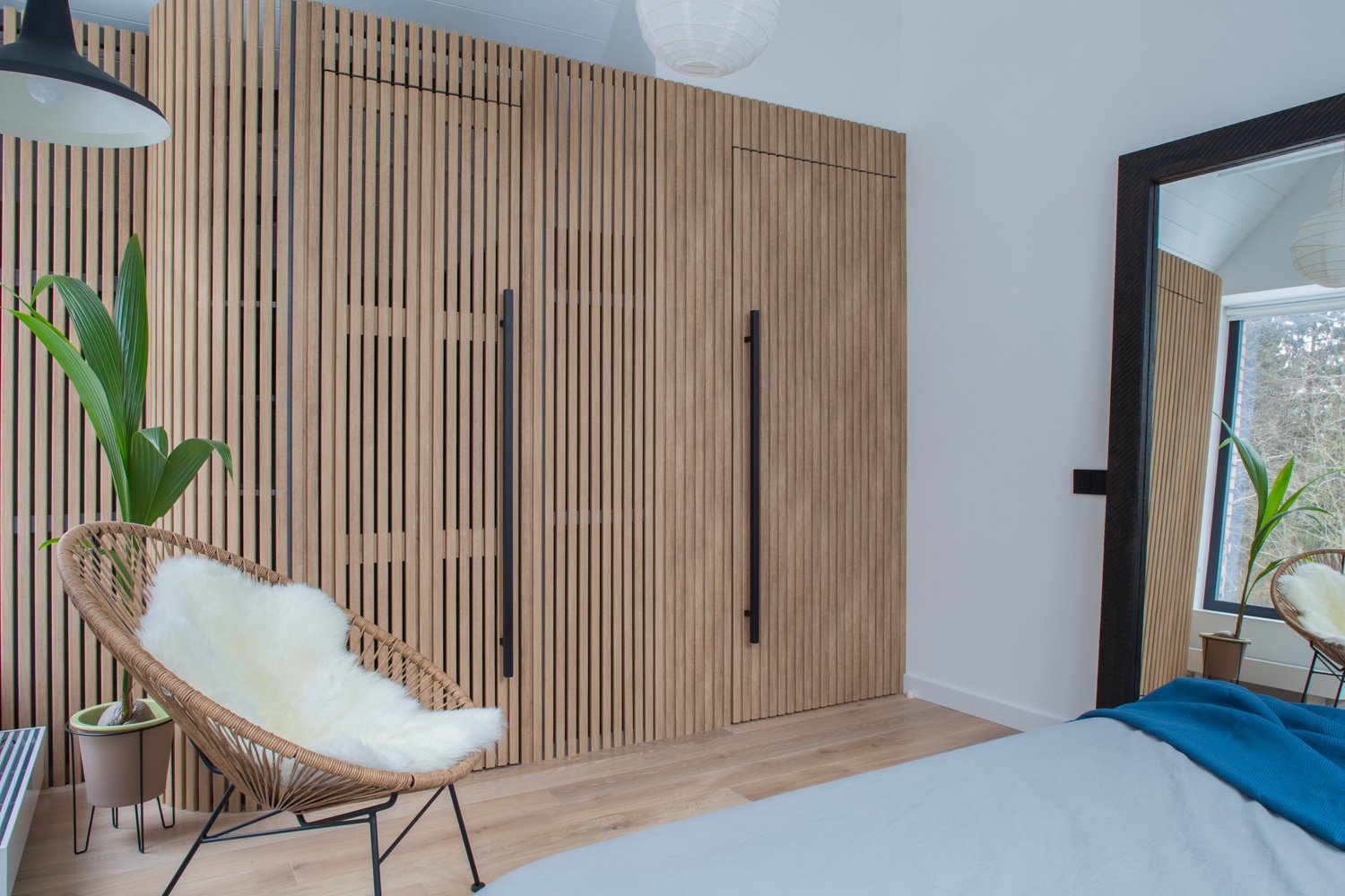 Спальня с деревянными рейками на стене