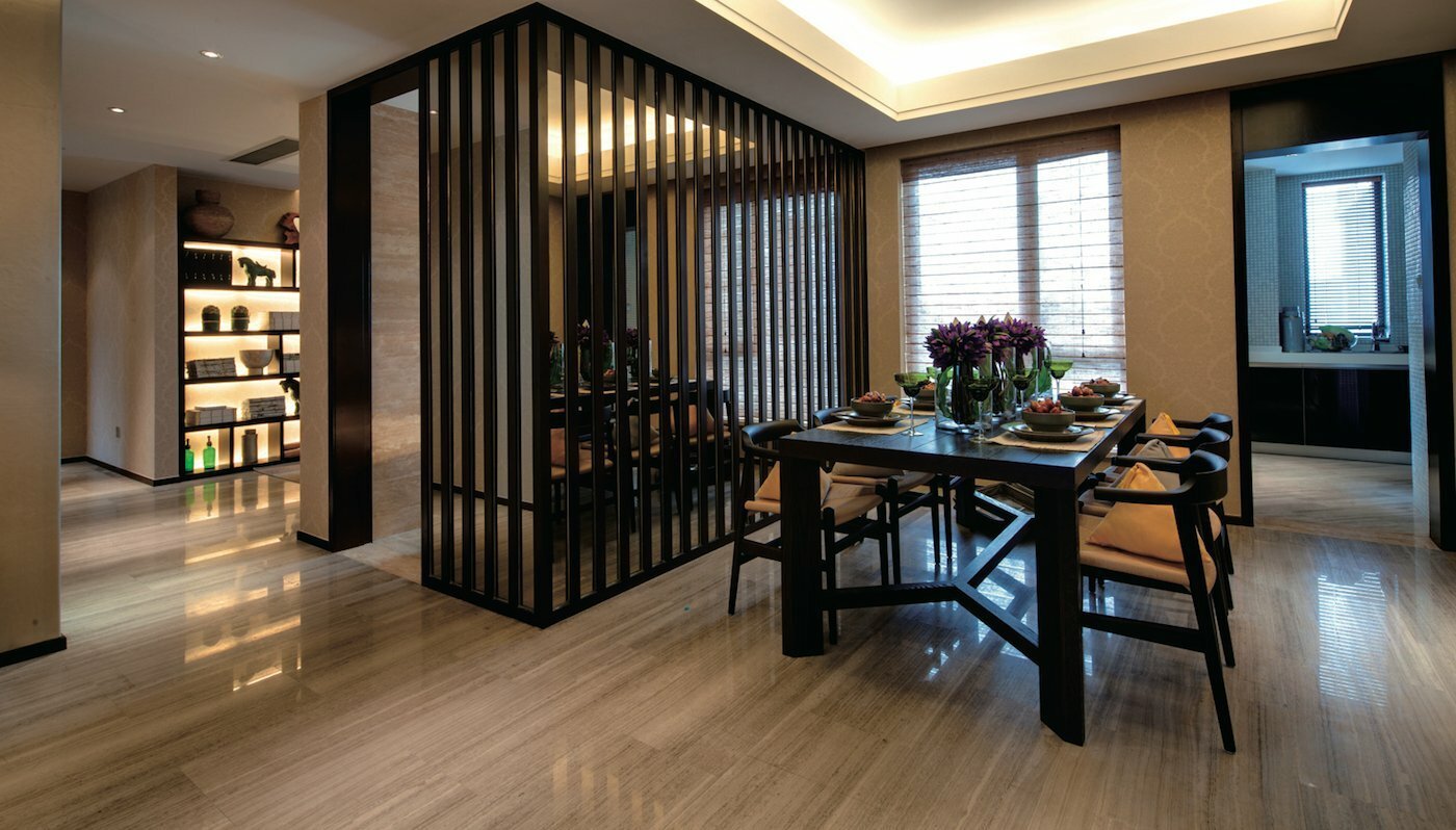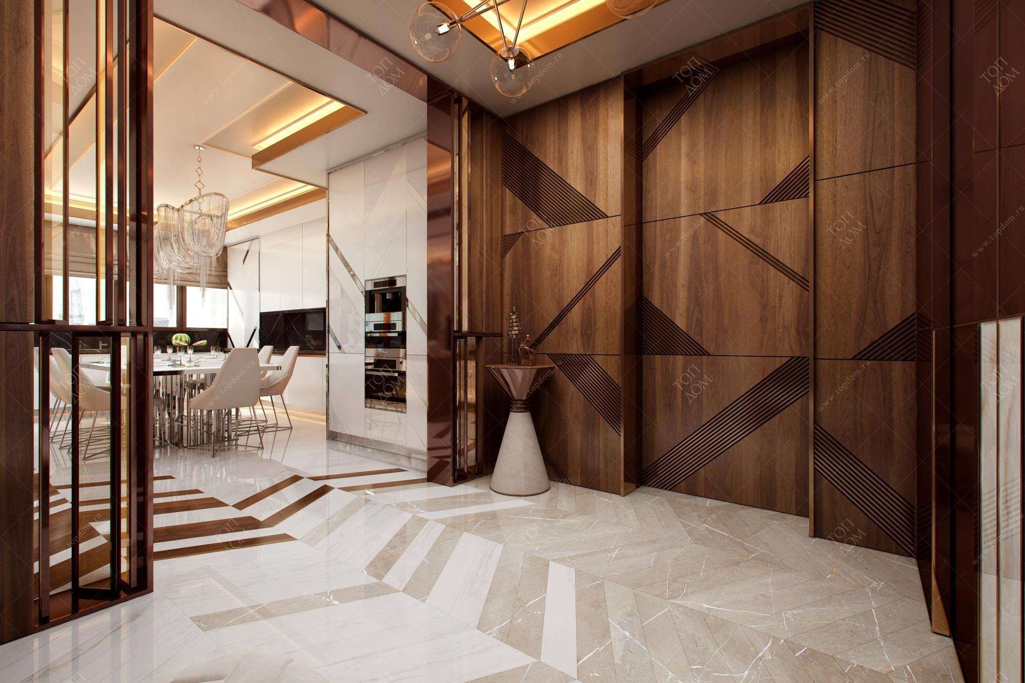 Сочетание мрамора и дерева в интерьере гостиной