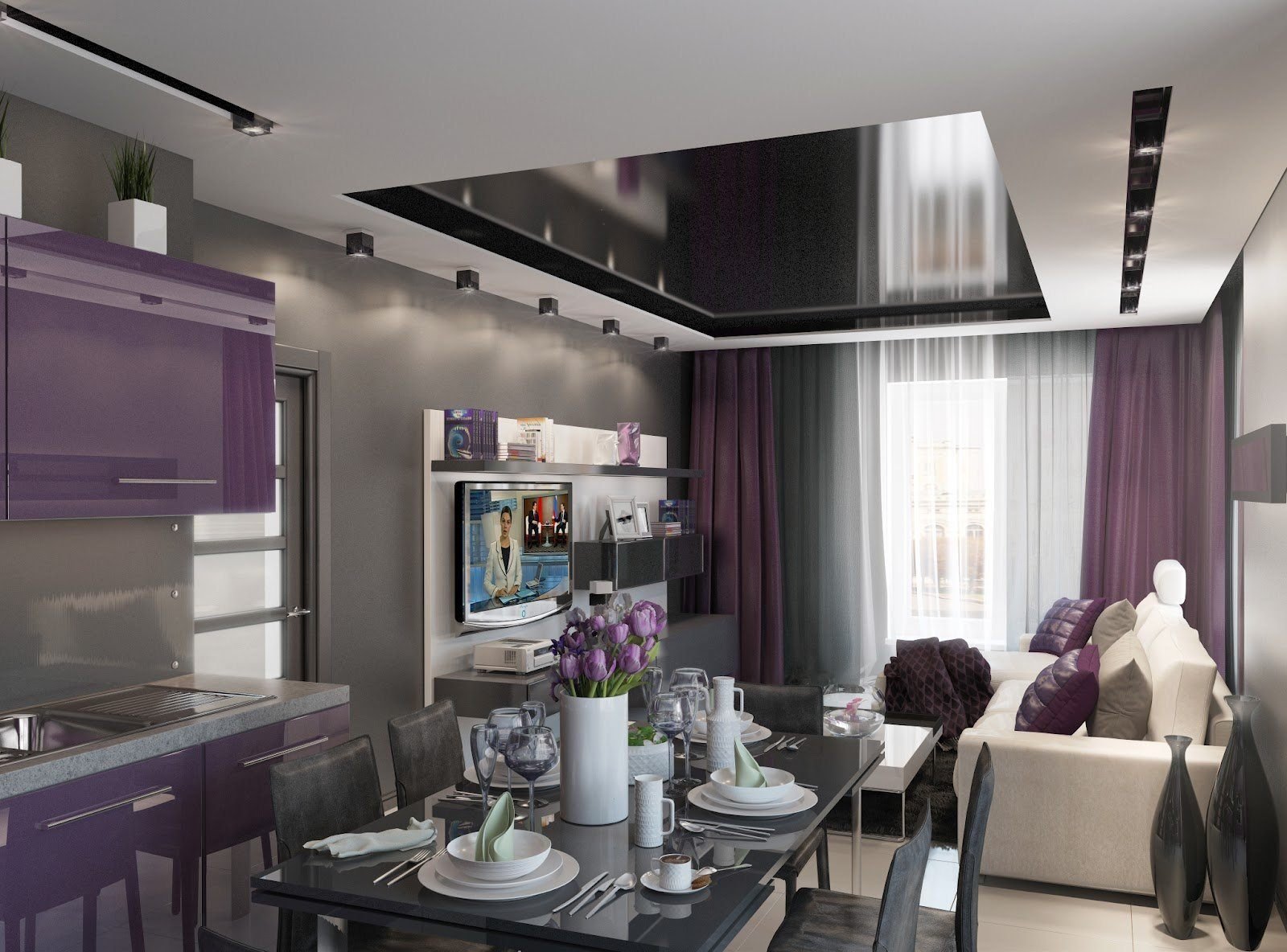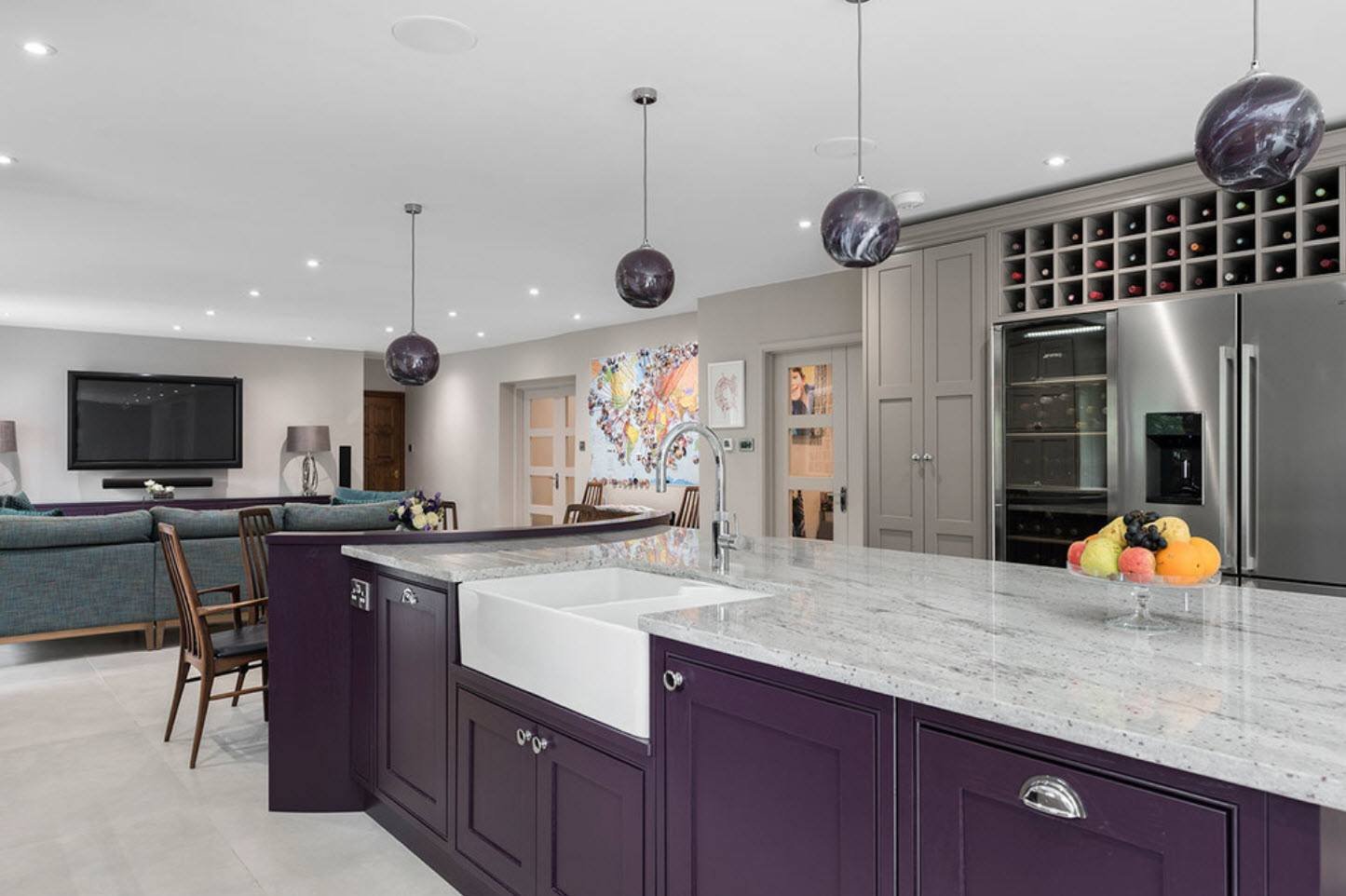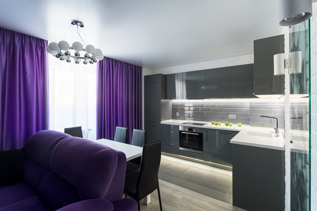 Кухня-гостиная в фиолетовом цвете