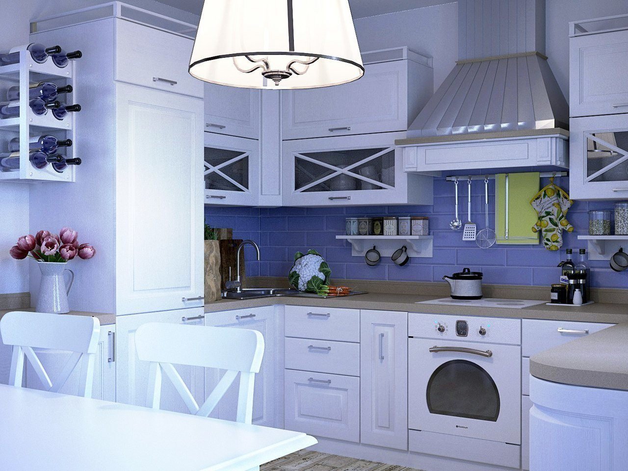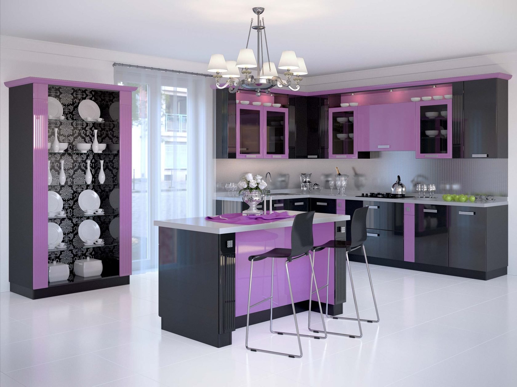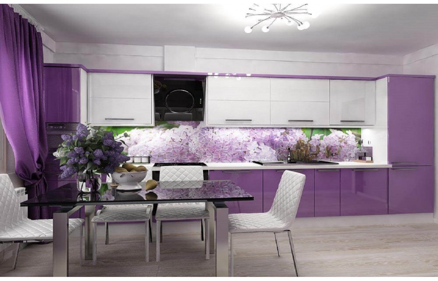 Белая кухня с сиреневыми акцентами