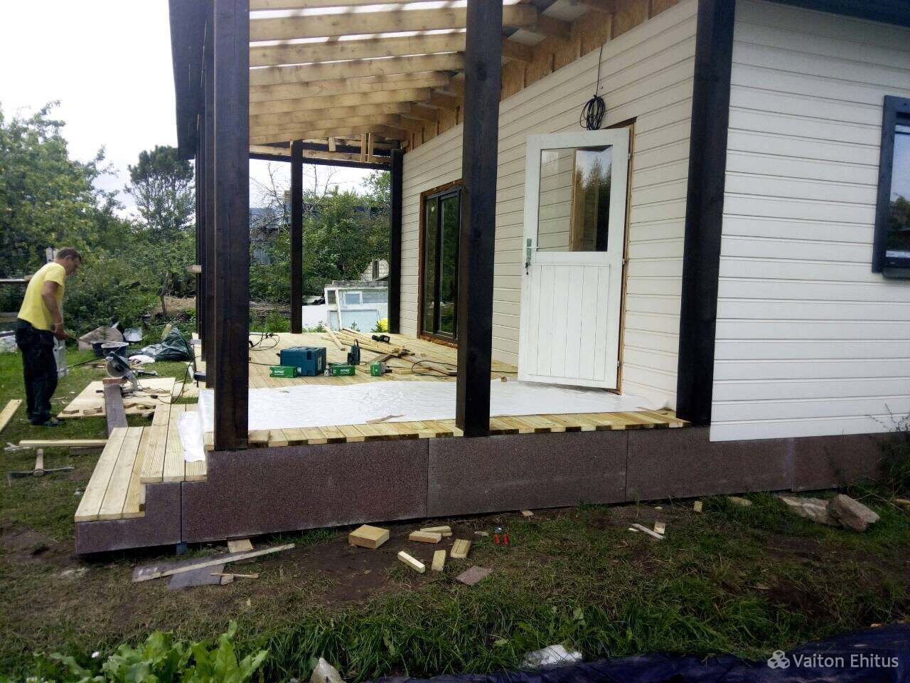 Терраса из дерева к дому из газобетона