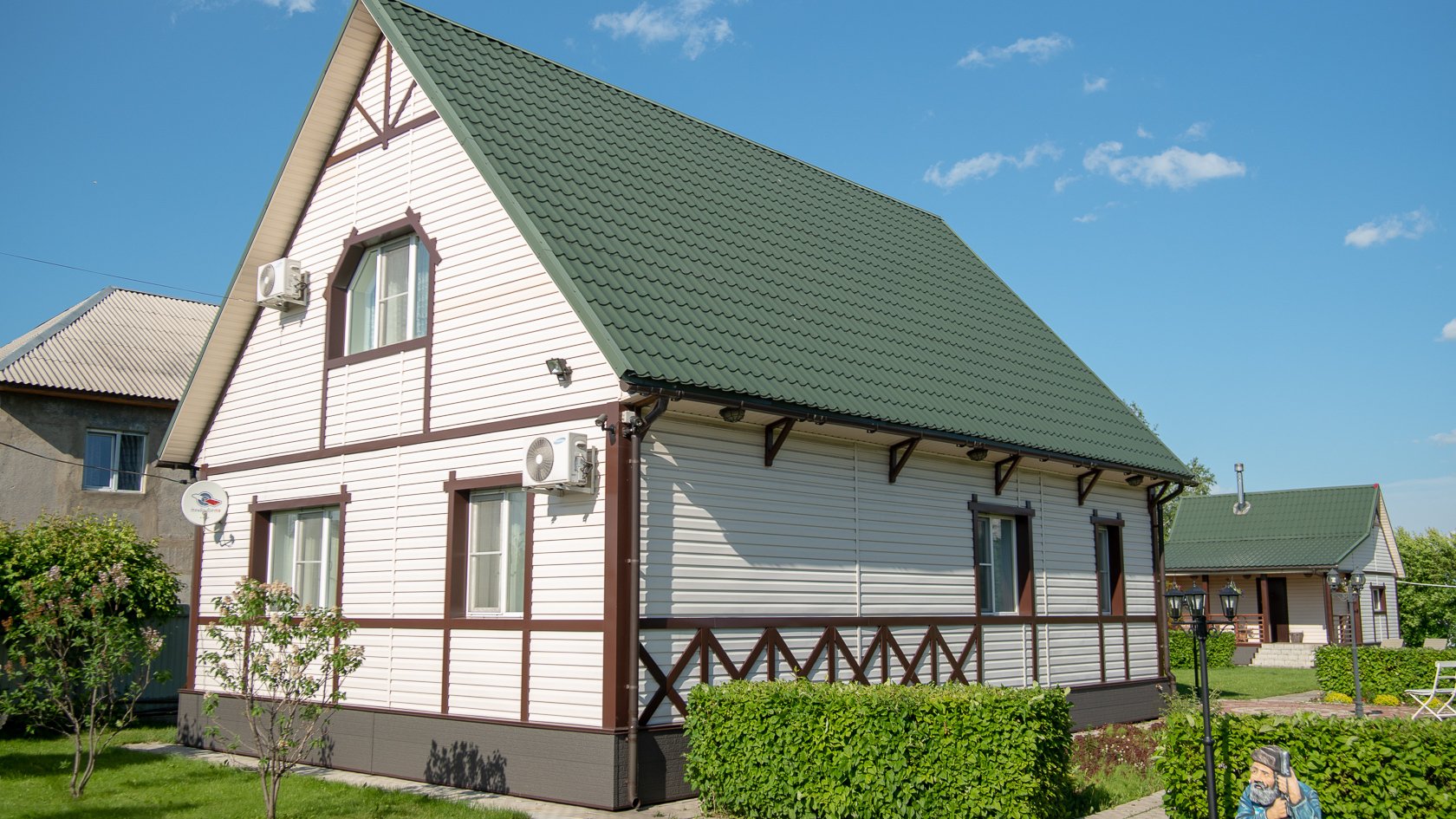 Зеленый сайдинг с коричневой крышей